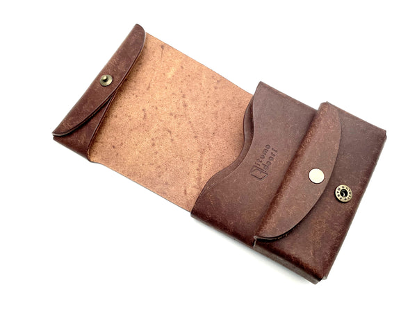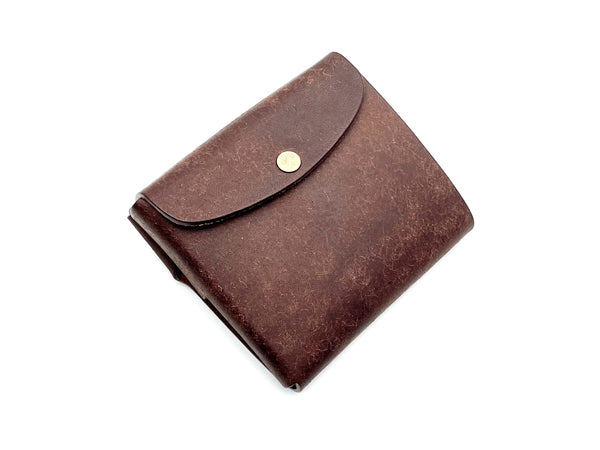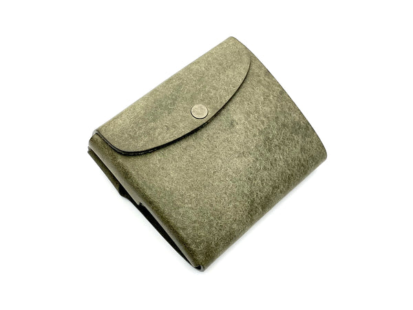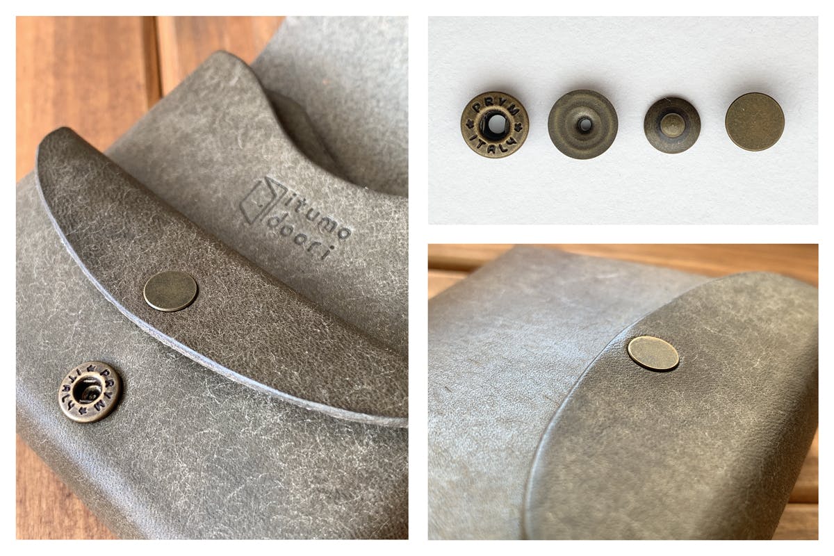 イタリアのPRYM社製のバネホックを贅沢に3か所に使用しており、バネパーツには「PRYM ITARY」の刻印入り。アンティークの落ち着いた色味で、経年変化を楽しむプエブロレザーと相性抜群です。