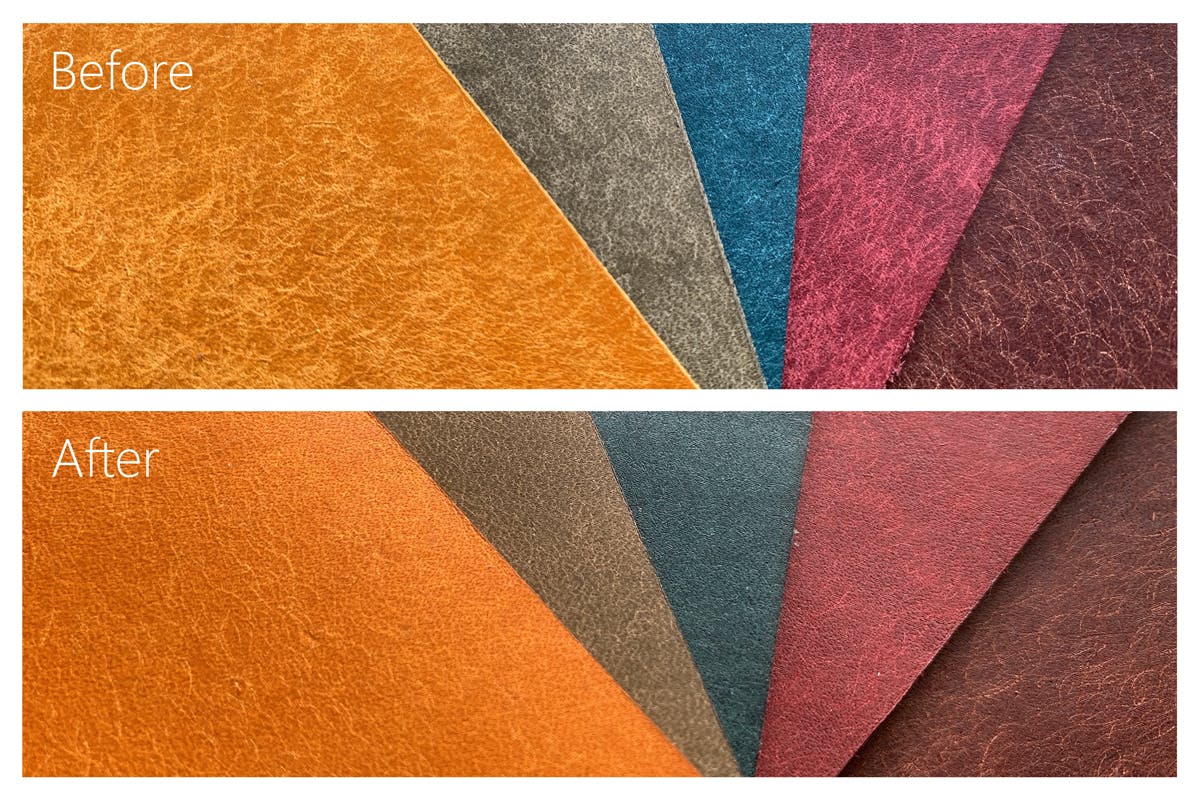 使用するにつれ毛羽立ちが革に馴染み、色味もしっとりとしたものに変化。作られる際の製法で、一般的な革よりもオイルを含んでおり、摩擦により中のオイルが少しずつ滲み出てきます。そのため乾燥から革を守るケアは不要で、とても気軽にご使用いただけます。