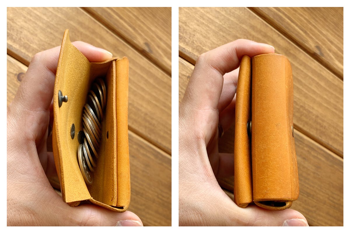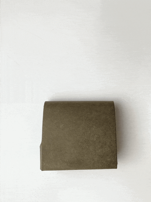 お札押え部分は革を折り返しているため、使用しはじめは厚みがあります。(お財布全体で約30mm)その厚みは使用するにつれ、25mm程に落ち着いてきます。