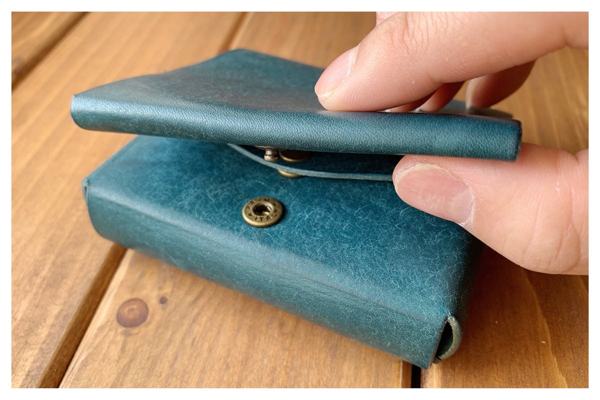 お札、カード、硬貨を取り出す際に一番開閉回数が多くなる上記写真のホックですが、開ける時に持ち手となる部分の革を二つ折りにしているため、耐久性抜群。指に当たる箇所の革がヘタることなく長く使っていただけます。